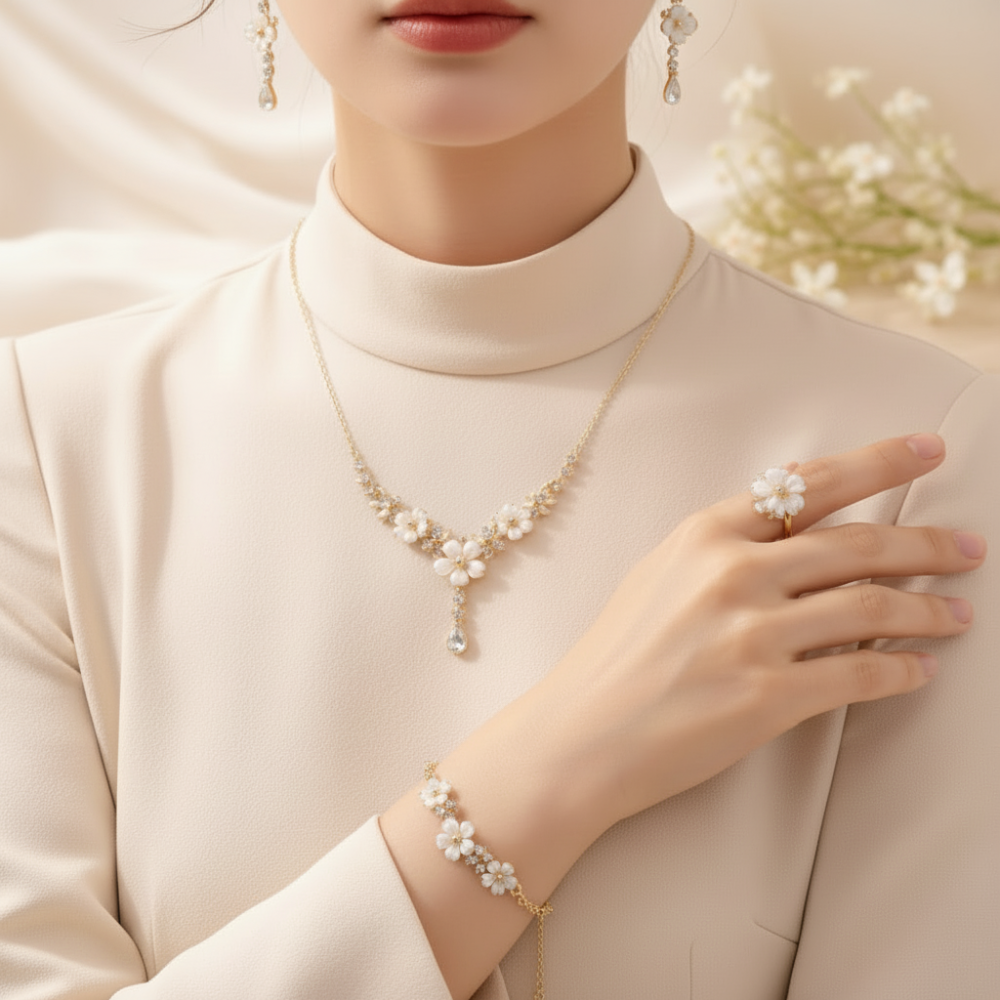 Cet ensemble de bijoux en acier inoxydable plaqué or est conçu pour apporter une touche élégante et harmonieuse à votre style. Fabriqué en acier inoxydable plaqué or avec des pierres décoratives en verre et des détails floraux en émail, il offre légèreté, confort et durabilité pour un usage quotidien. Le collier, les boucles d’oreilles, le bracelet et la bague présentent un design floral délicat qui crée une apparence raffinée et intemporelle. Portez les pièces ensemble pour un look coordonné ou séparément avec des tenues décontractées ou plus élégantes.